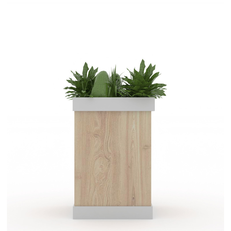 Esta jardinera separadora cuadrada combina la calidez de la madera con detalles modernos en blanco, ofreciendo una solución práctica y decorativa para dividir espacios en cualquier entorno.